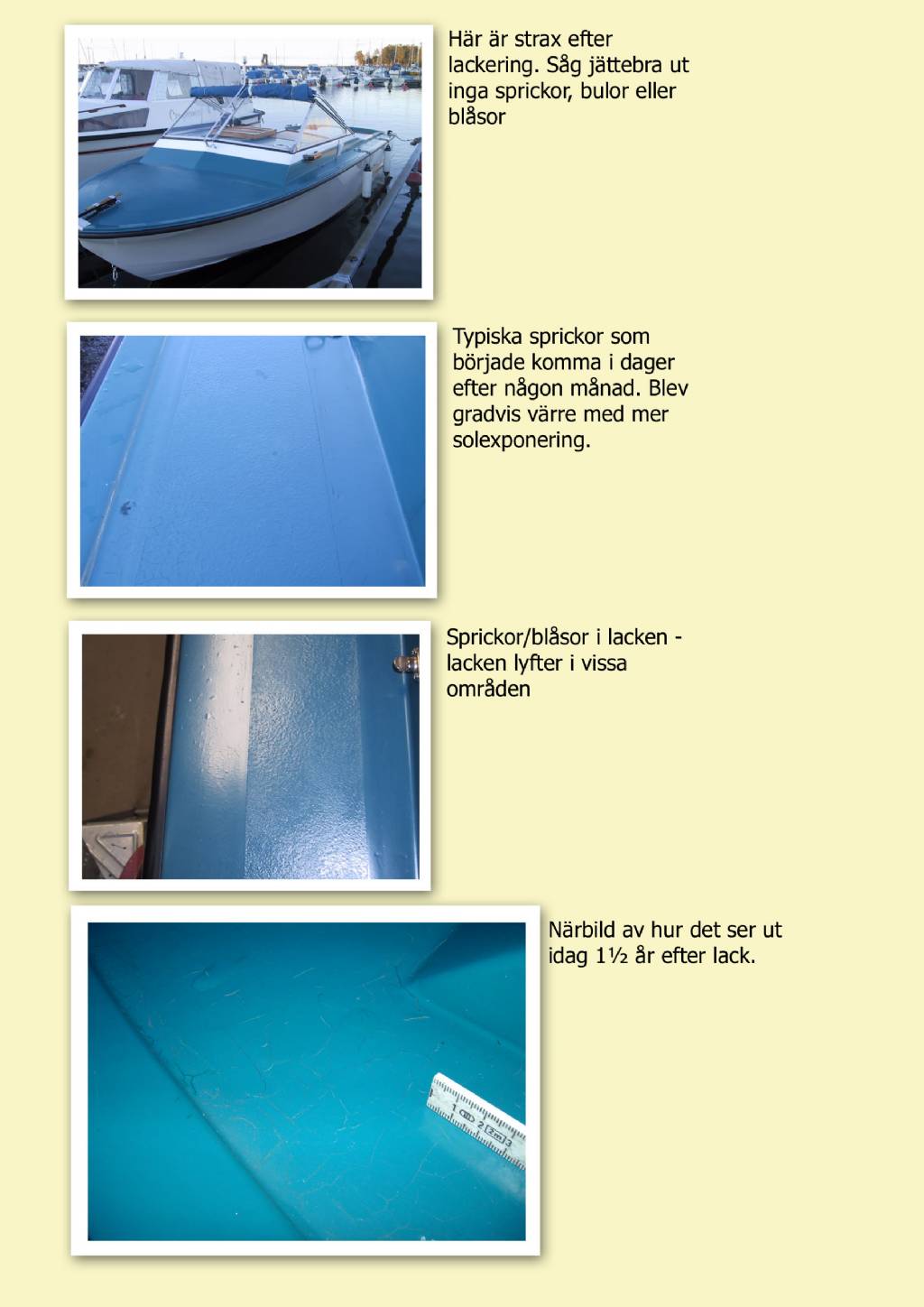 Nu har båten både sprickor och blåsor. Dock endast överbyggnaden, skrovet är perfekt.