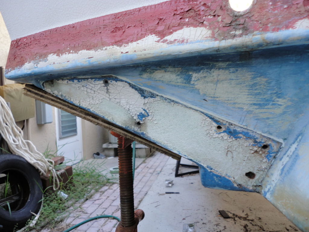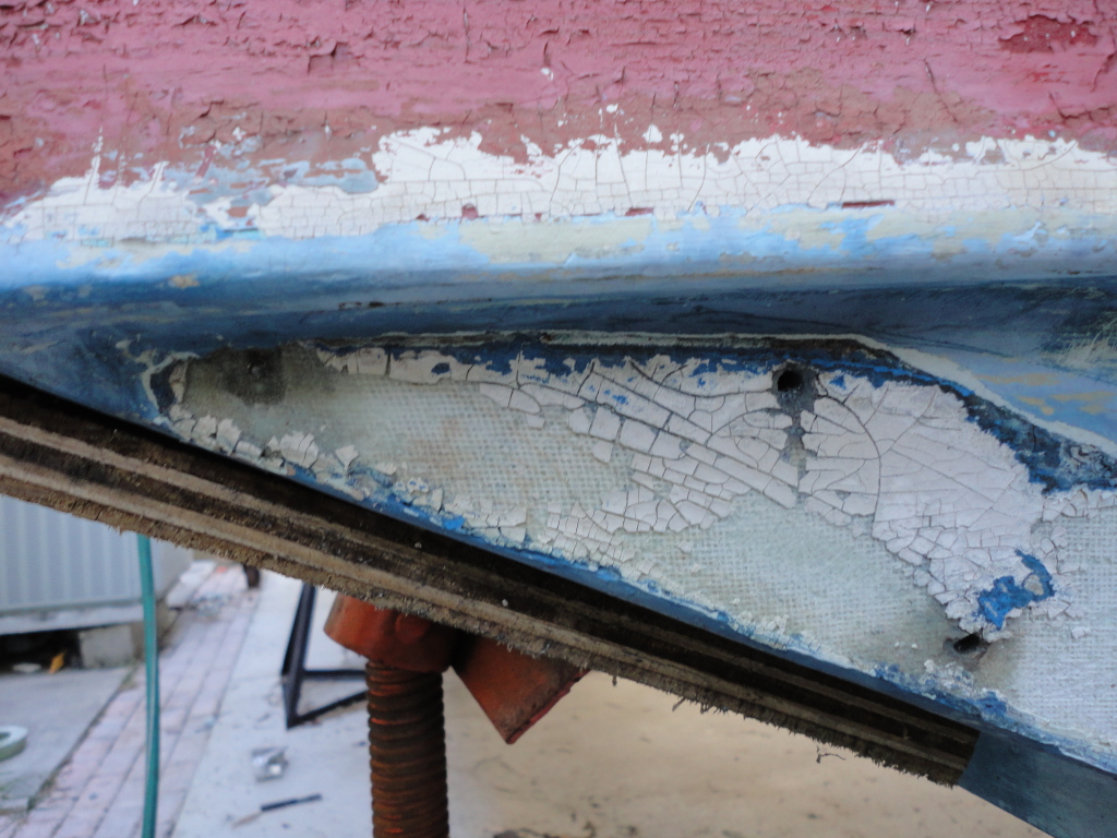 Den har som du observerer også fått et lag med to-komponent barriere under vannlinjen. MEN barrieren ble malt RUNDT trimplanene, så det er faktisk gelcoat vi ser på bildet. Her har du ett mer detaljert bilde hvor du tydelig ser glassfiberduken der gelcoaten er borte. Jeg skal ikke påstå at det er så mye relevant læring her, men hovedpoenget mitt er at det er interessant å observere at ødeleggelsen er ståpass mye større under tabs-brakettene.