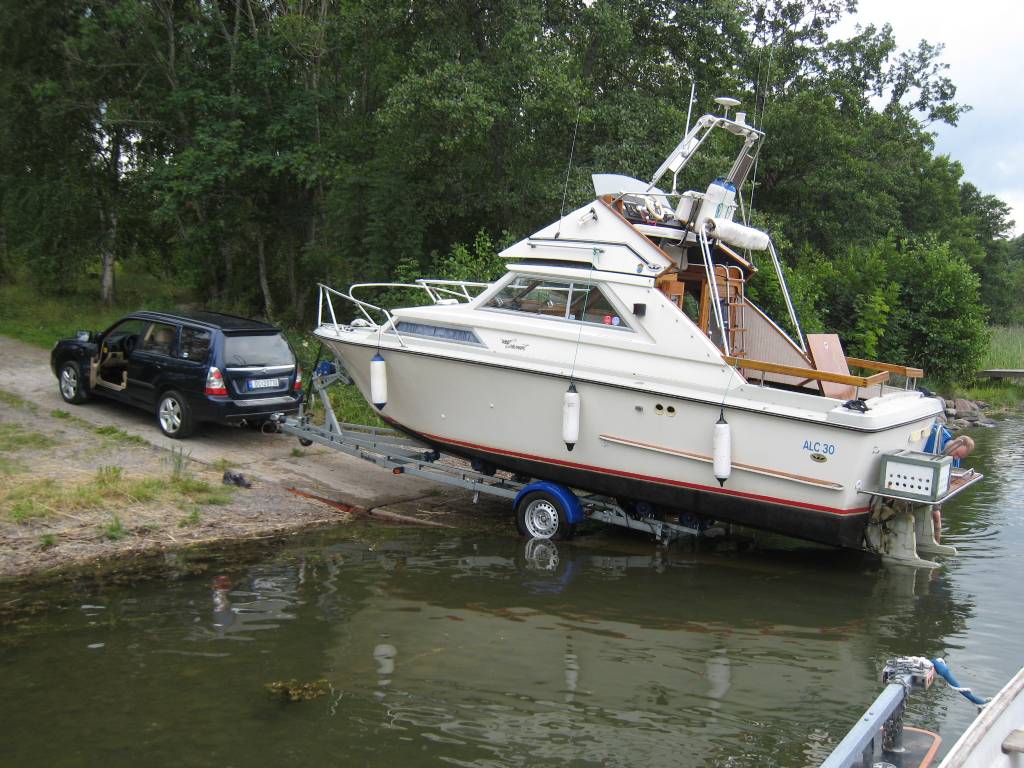 Tog en test och drog upp båten på min lilla båttrailer, det gick visserligen bra men det var nog en stor påfrestning på vagnen. Luftning av trimhydraliken gick bra men sen sprack slangen inne i motorrummet med ATF- olja överallt. Vet dock att bilen orkar dra utan problem så ny större vagn och elektriska trimplan kommer på "att göra/köpa listan"