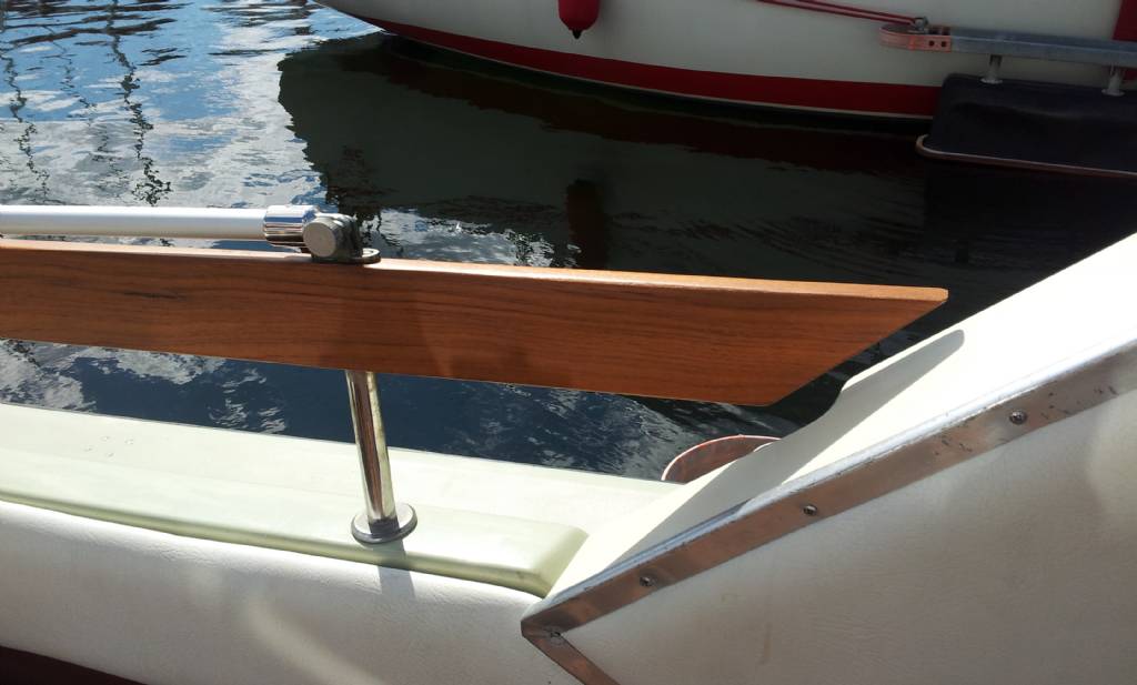 jag håller med webm. Illa placerat räcke! På OF är denna avkortad för ett lätt insteg till akterdäck. Jag hade prövat med att kapa och sätta dit ett gångjärn och en hake för att låsa den i stängt läge.