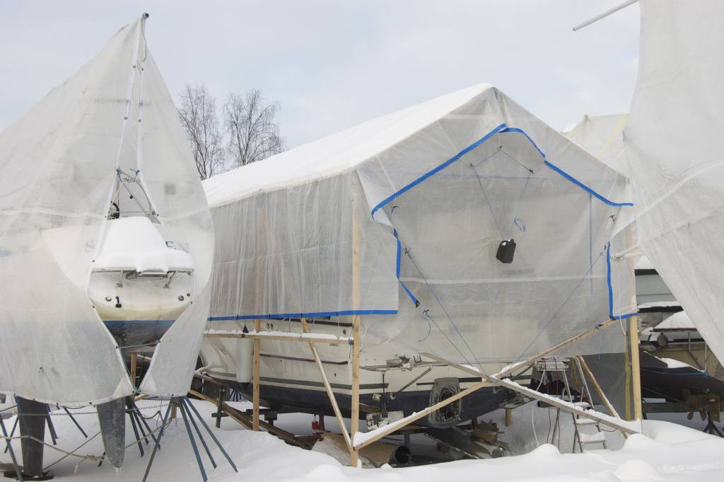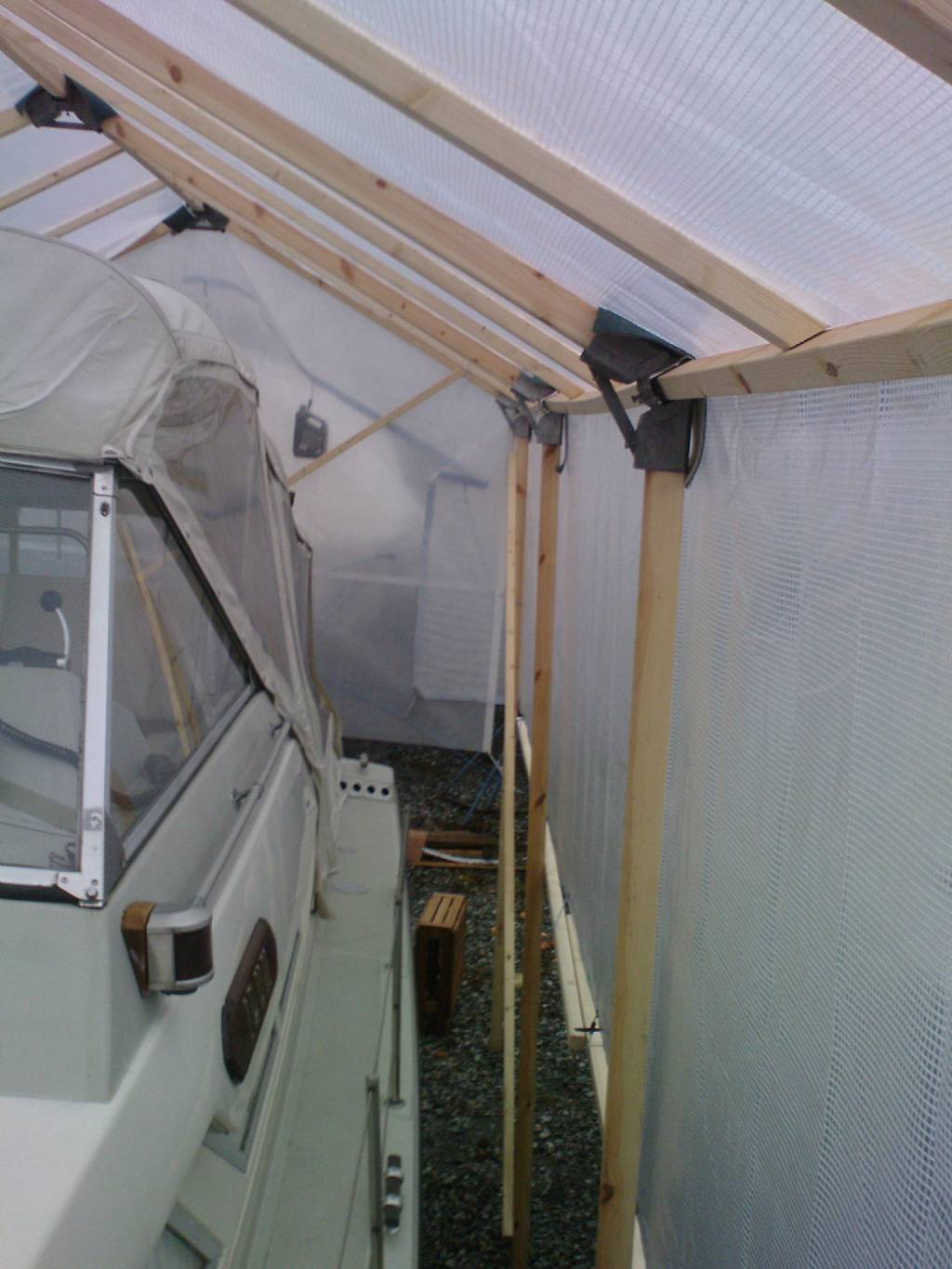Jag har testat olika varianter av täckställningar. Sedan några år tillbaka bygger jag båthus av reglar och burwallskopplingar. Fördelen är att huset står direkt på marken och belastar inte båten, dessutom går det att röra sig på däcket. Det funkar utmärkt att pyssla lite med båten, både in- och utvändigt.