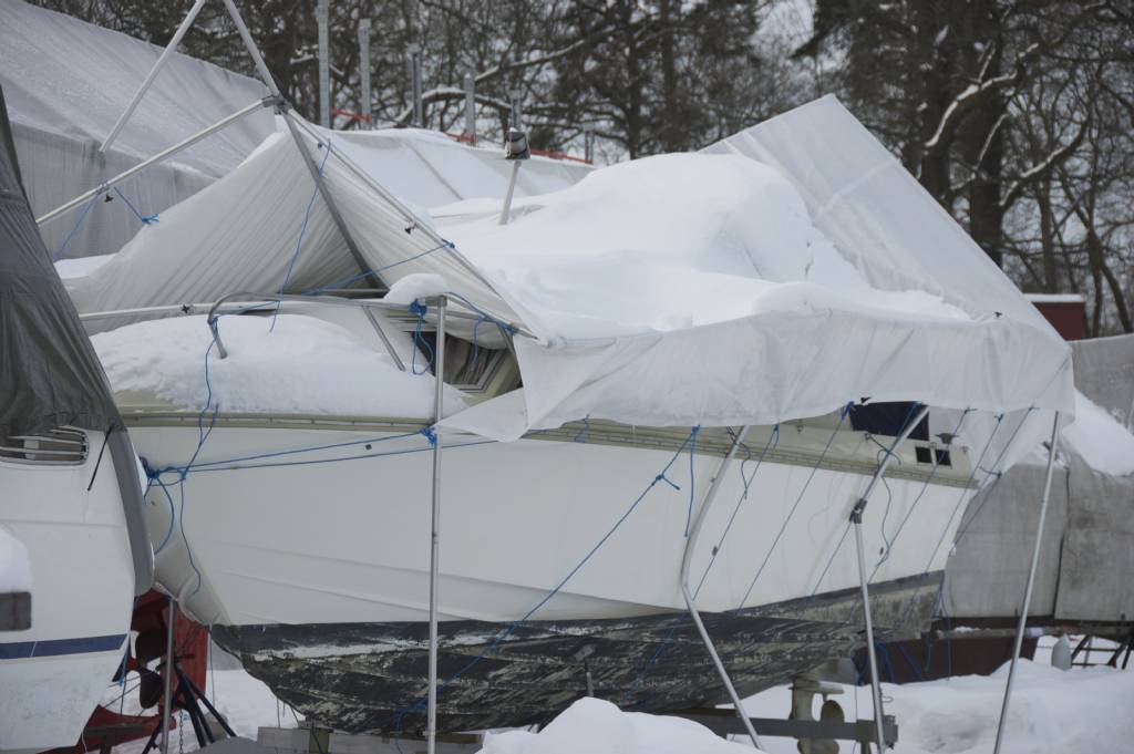 Bilden var mycket riktigt tagen på Margretelundsvarvet, Bromma, i februari i år. Det var ganska många båtar där ägarna blivit överraskade av att snön kom redan i november och därför inte hunnit få på täckning. Dessutom flera båtar där täckställningen kollapsat under snön.