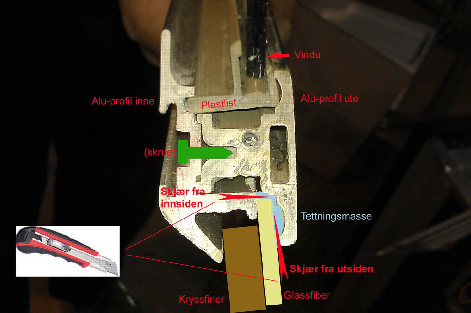 - Når du har tatt av alle 4 Alu-profil inne, skjærer du gjennom tettningsmassen (blå) fra innsiden mellom finer/glassfiber helt gjennom til Alu-profil ute rundt hele vinduet.