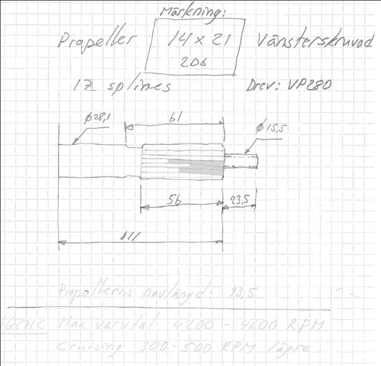 Propellern jag har (som reserv) är 14x21 L (vänsterskruvad) för drev med kort axel. Jag blev lite överraskad, för jag har samma diameter och stigning på den propeller jag har idag, fast med långt nav och större motor (V8, AQ2271C) + VP280-drev.