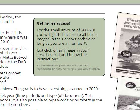 Snöade in helt på Coronetarkivet i helgen. Mycket sköna bilder och intressant läsning.Tror kanske att det skulle bli tydligare samt locka fler att ansluta sig om det i den lilla rutan med röd text framgår tydligare att jag som betalande får tillgång till hela arkivet. Den rutan skulle också kunna fungera som länk direkt till betalning.Nu kan man få uppfattningen att man endast får tillgång till bilder av den modell jag väljer för att komma till betalningsfunktionen. Iofs framgår det i den gröna rutan att jag får full access. Kanske bara jag som är lite trög! Försökte frenetiskt klicka på rutan med röd text helt utan framgång tills jag började läsa lite mer noggrant och blev varse hur betalning skulle göras. Hursomhelst en bisak i sammanhanget, arkivet är fantastiskt..
