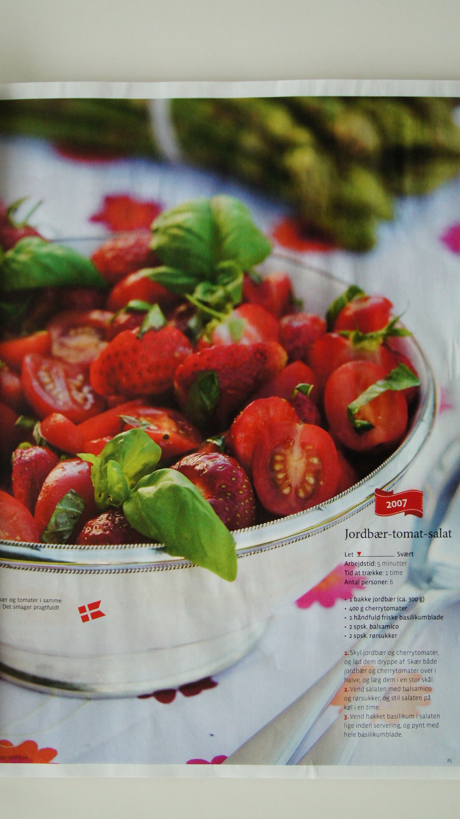 Lørdag aften havde Vivian lavet en jordbær-tomat salat, som var ret populær. Flere efterspurgte opskriften, men for at også andre kan få fornøjelse af den, kommer den her. Den er fra 2007 og fra Spis Bedre. Velbekomme. :-)