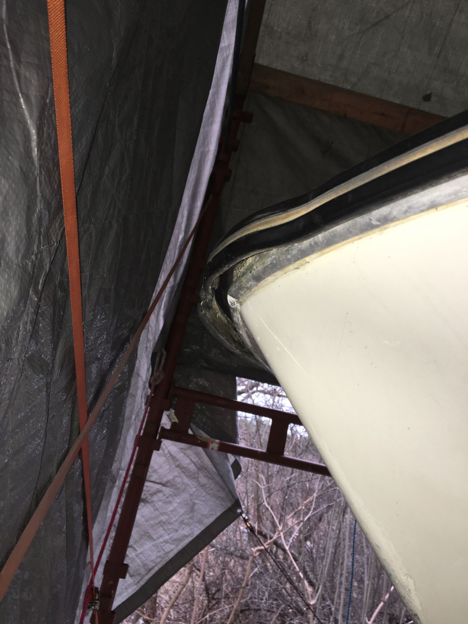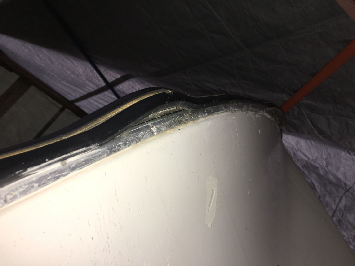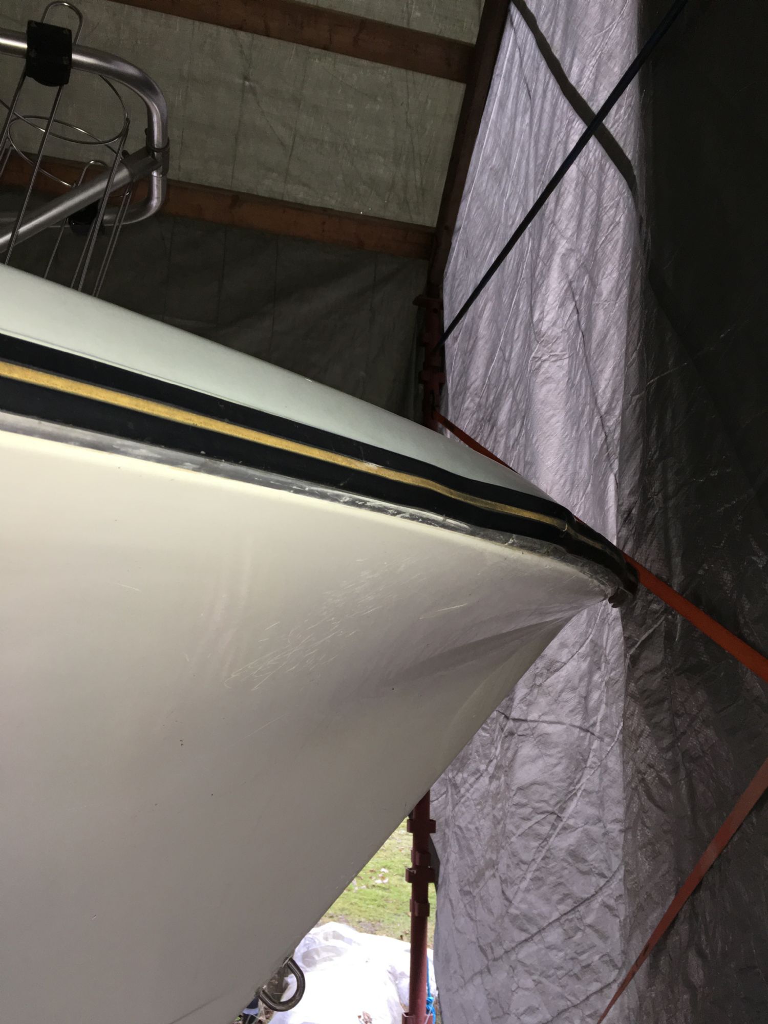 Köpta båten förra säsongen och då var relingslisten skadad på några ställen. Dessutom har den "krupit" ur sitt fäste. Jag skulle tro att förre ägaren stött emot kraftigt mot något rakt fram i fören så att listen delvis gått av längst fram och dessutom tryckts ur sitt läge på två ställen ca 1 M från fören på sidan. Jag tänker byta till en ny någon gång men andra saker har prioritet just nu.