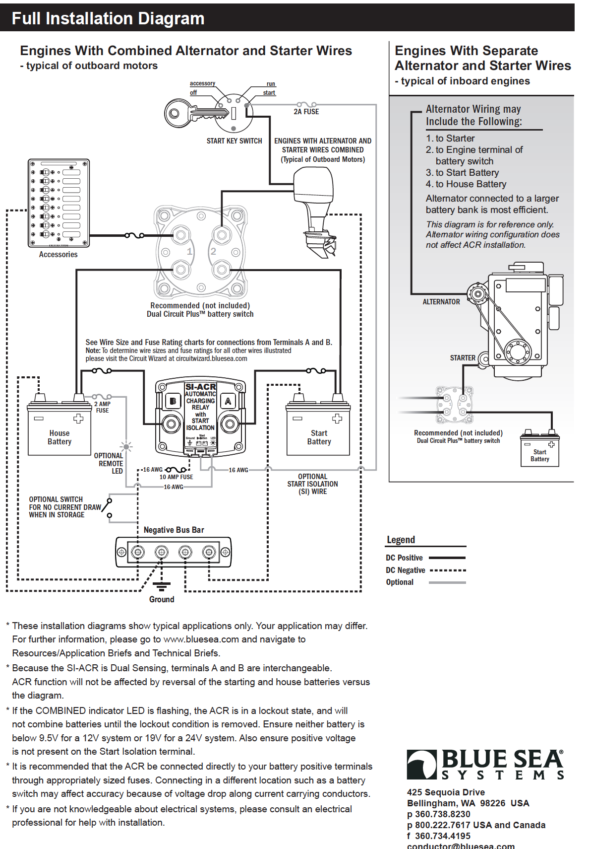 Med ny motor och drev installerade är det nu dags att koppla in ny el på motorsidan. Jag har bl.a. beslutat att montera en batteriskiljare från Blue Sea ((SI-ACR, PN 7610). Medföljande instruktioner är något sketchartade och jag undrar om någon kan säga om man (som jag tror) skall ansluta startbatteriets pluspol till B+ på generatorn?