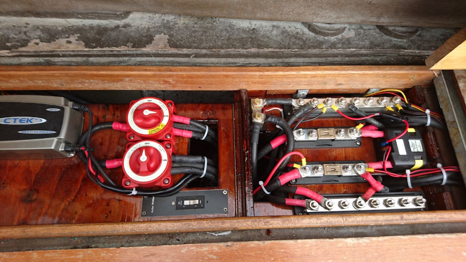 Hej, jag skulle vilja höra lite synpunkter på en installation jag gjorde -nu sex år sedan. Jag har ingen brytare mellan motor och det batteri som är startbatteri(ett). Sedan har jag ett Blue Sea skiljerelä -fjärrstyrt- mellan batteri två och alla övriga förbrukare; radio, GPS,VHF, kyl, lampor… Jag resonerade att om man bilar alltid har batteriet inkopplat till startrelä och motorinstrument, varför bygga in en extra felkälla (=brytare). Ett relä ser till att båda batterierna laddas då motorn är igång. Har fungerat utan problem sex år.