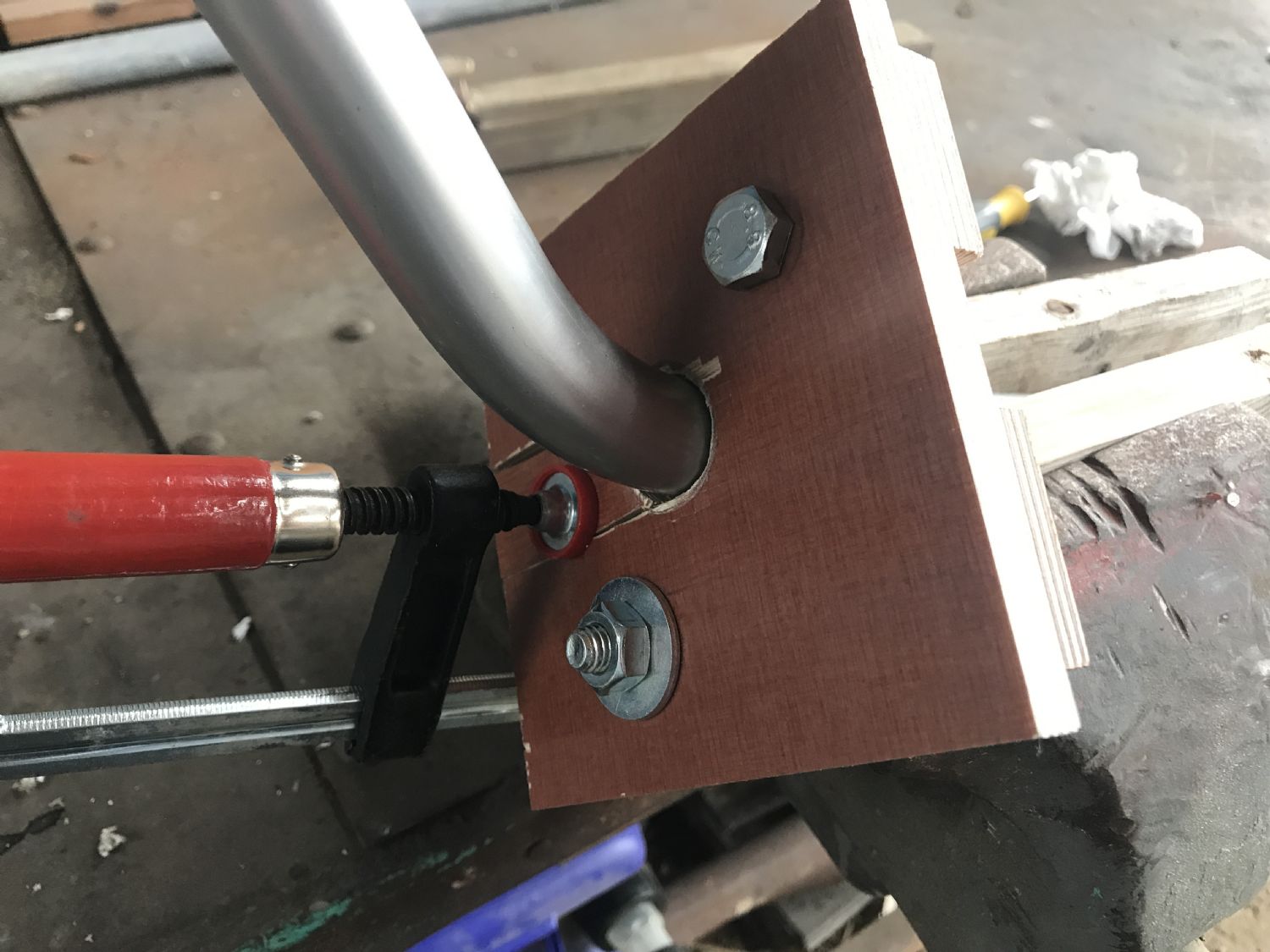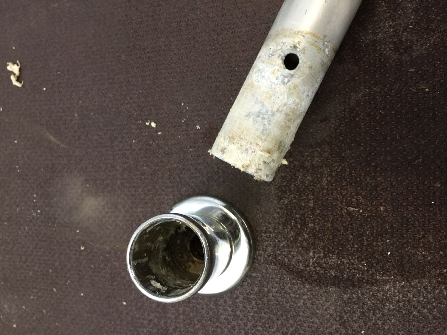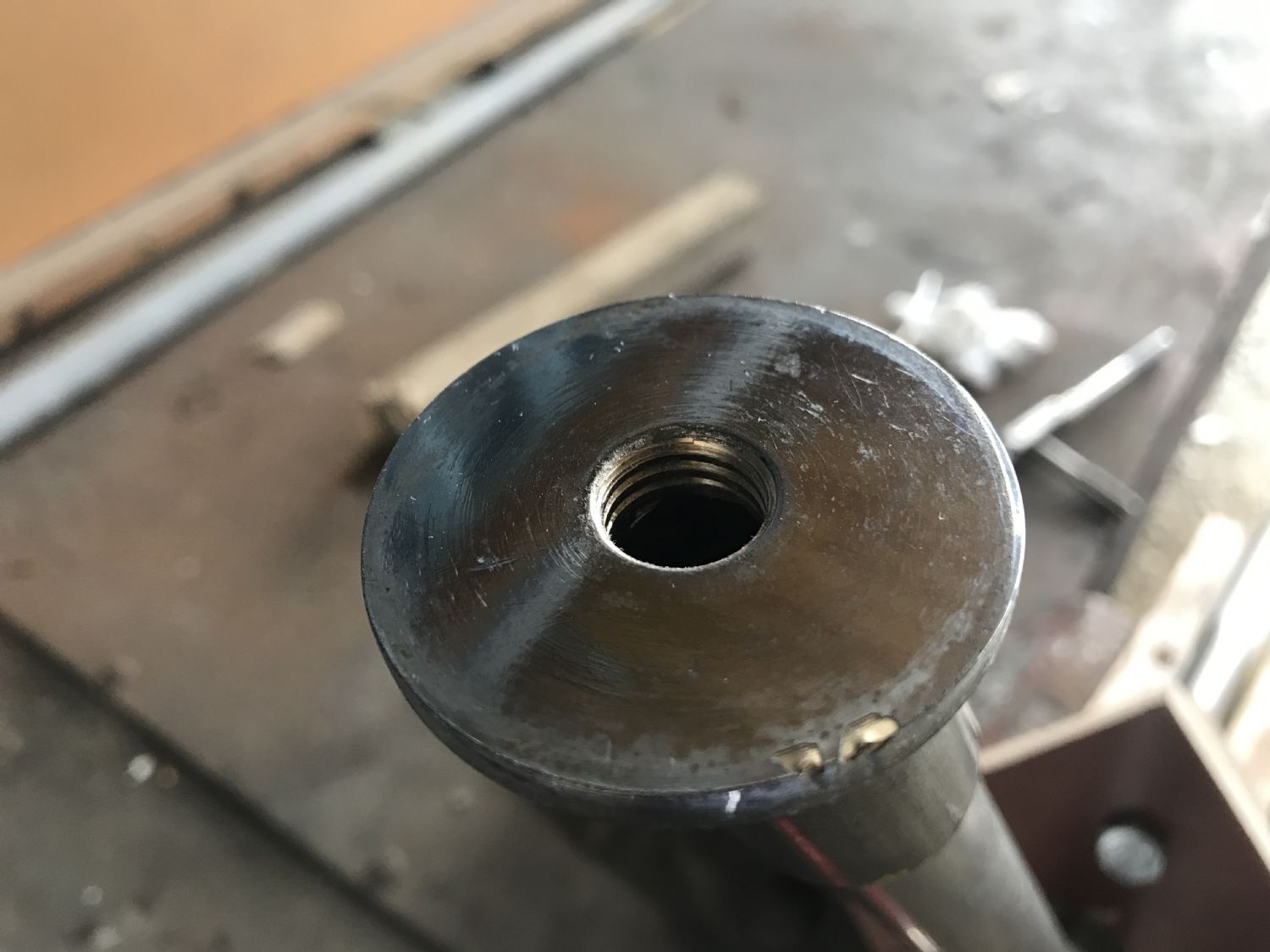 Slutligen valde jag att gänga direkt i fästet. Blir att borra upp hålen i skrovet en smula. M14 var dimensionen jag använde. Har ej återmonterat på skrovet ännu, men känns bra hitintills.