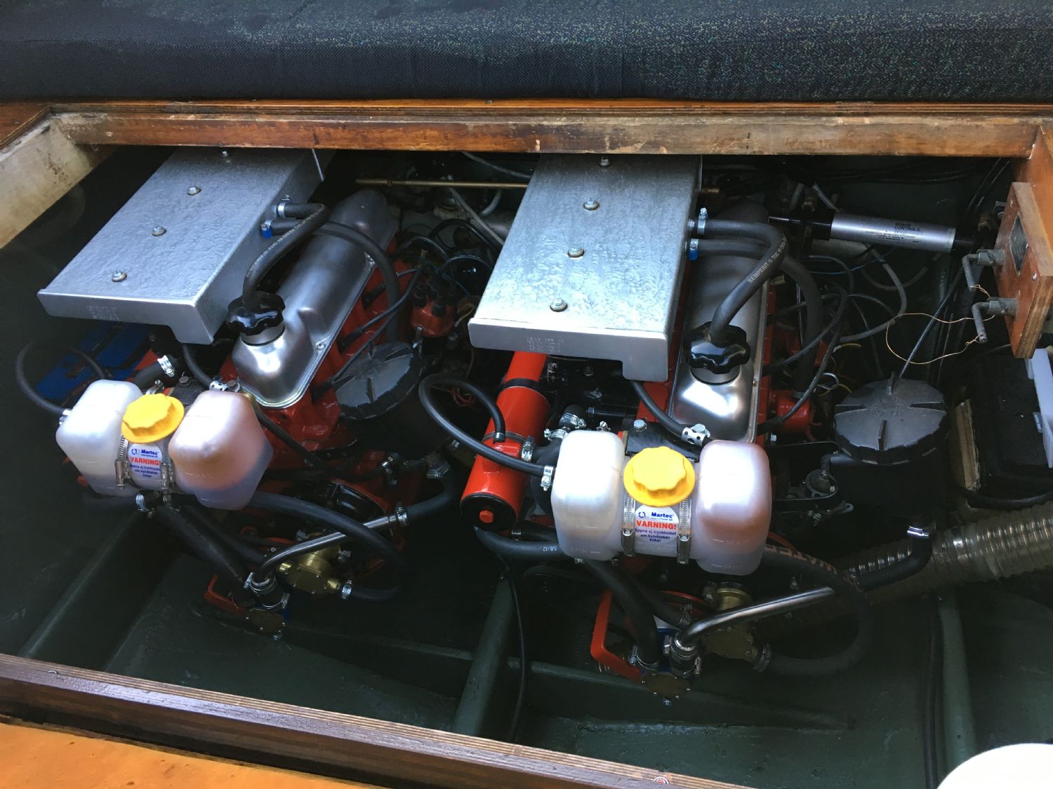 280-dreven blev det en totalrenovering på också. Hade tur att motorrenoveringen blev relativt billig då han gjorde det hela utan egen vinst. har kört in dem denna säsong, (10 tim). Allt verkar bra. Dock hög bränsleförbrukning, ca 2,5 dist. Den kan säkert bli mycket lägre med en modern V8. Men klart frän känsla att starta två motorer.