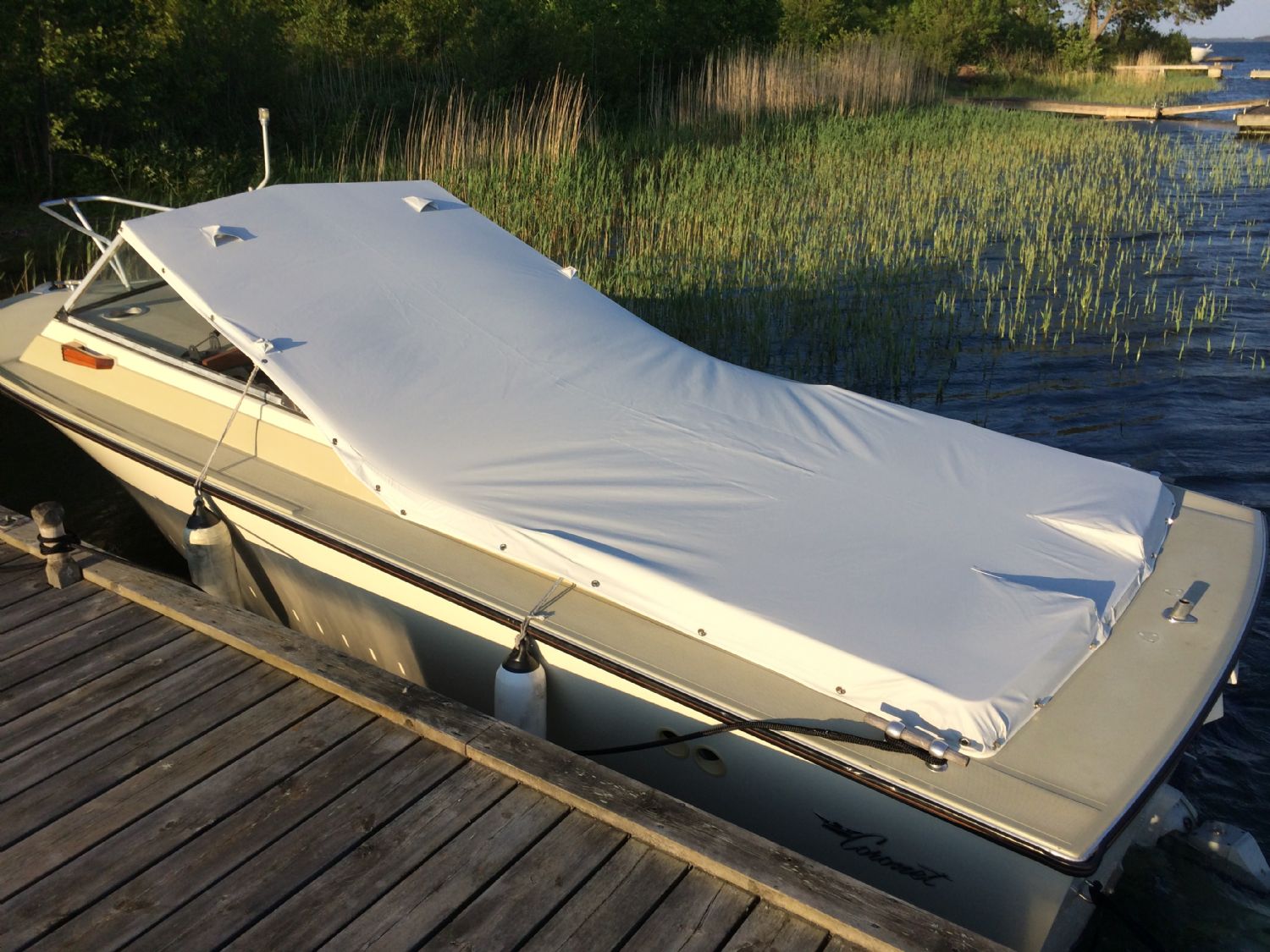 Här en annan lösning som fungerat helt klanderfritt: Två stycken insydda "ventiler" i den främre delen samt nyttjande av motorrumsventilationen akteröver. Ingen kondens alls. Materialet i kapellet är Stamoid.