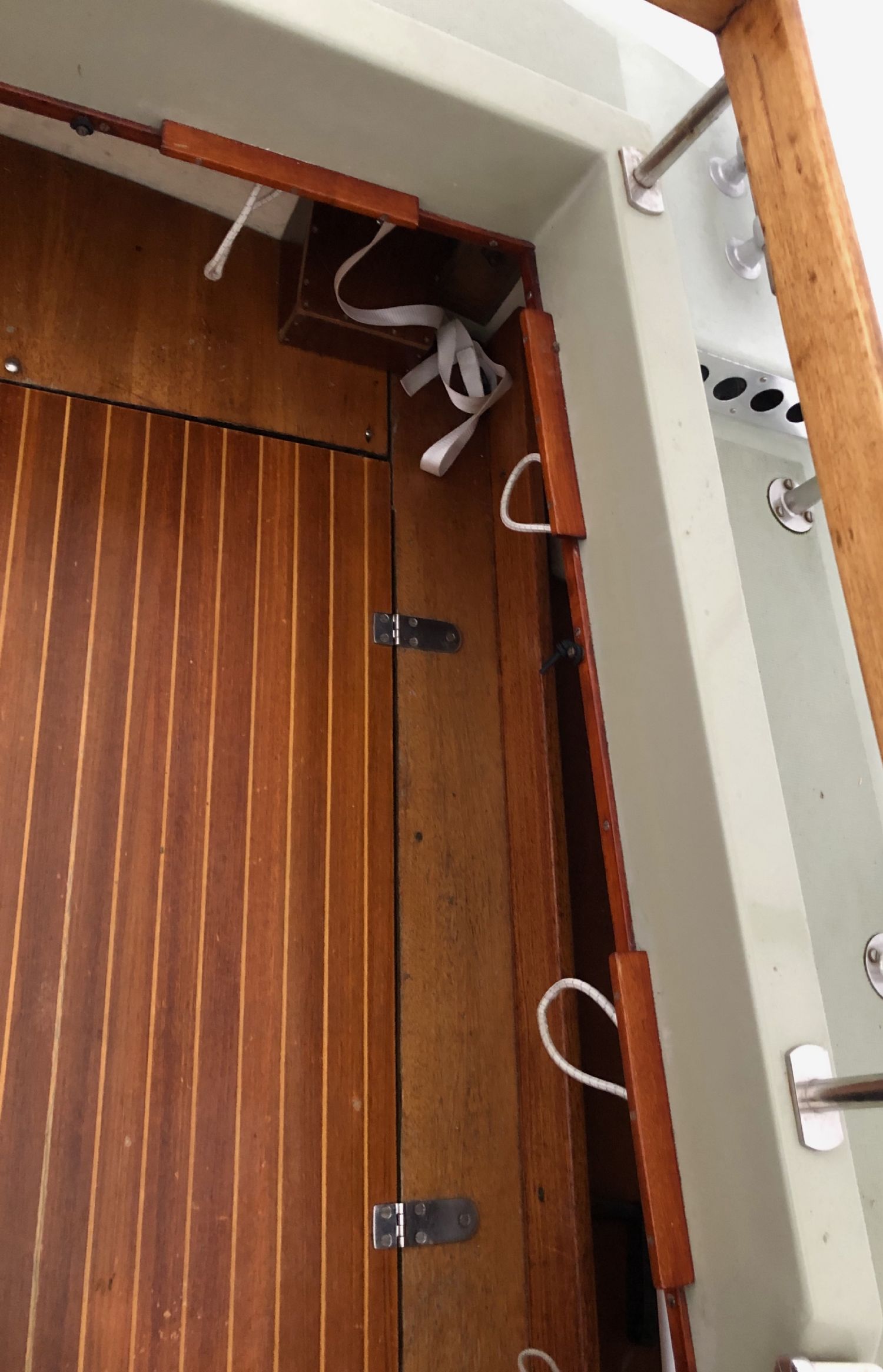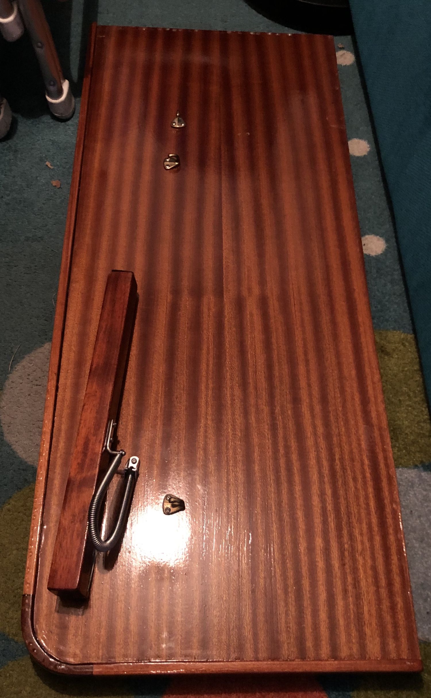 Bifogar lite bilder på bänk och fästen/stöd i sargen på akterdäck. Benet har ett gångjärn och en fjäder som låser det i utfällt läge. När det är uppfällt går motorrumsluckan att öppna lite.