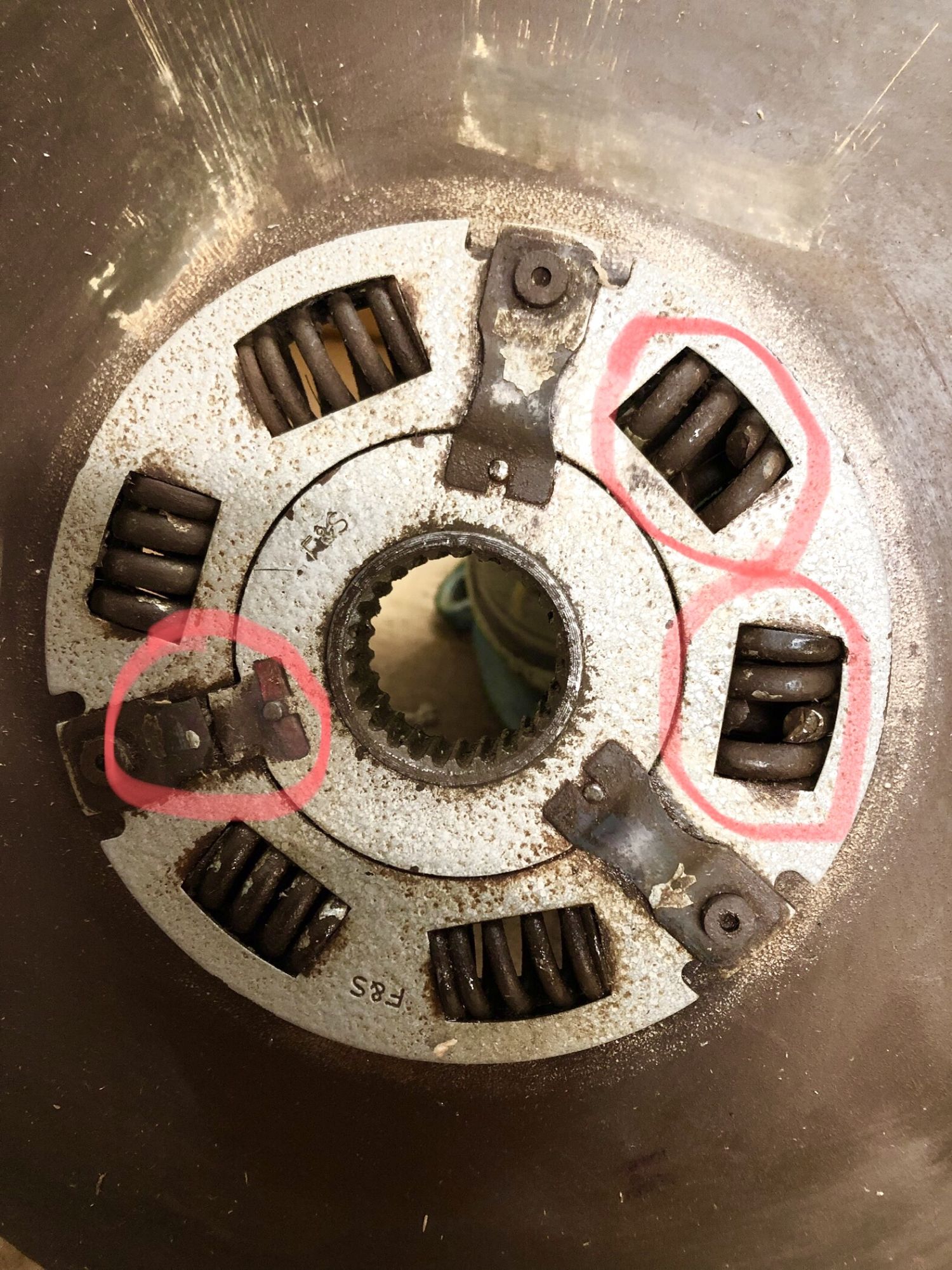 Plockade bort ”struten” för att byta lager i den och hittade då ett annat fel. Splinesen på Mellanaxeln som går genom stuten ansluter mot en ”Ryckutjämnare” som sitter på svänghjulet och som påminner om lamellpaketet på en bilmotor men utan lameller. Här finns 6st kraftiga fjädrar varav 2st var avbrutna. Även 1av 3 fjädrande bleck var trasigt. Detta kan vara orsak till det svagt skramlande ljud som hörts på tomgång. Tänk att grejerna inte skall hålla mer än 42år. Nu blir det till att köpa en ny ryckutjämnare.