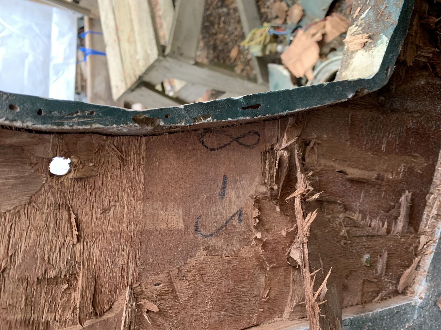 Hittade siffror i tusch inne mellan plywoodlagren. Kul va! Det är ju ändå minst 44 år sedan någon skrev där. Jag håller Bl a på med kyrkorenoveringar i stor skala i mitt arbete och då dokumenterar vi allt vi hittar.