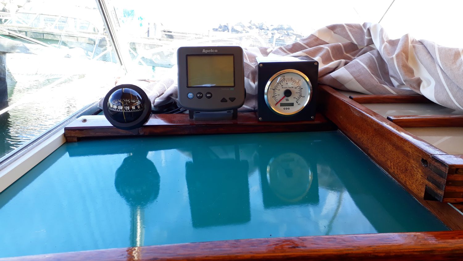 Jag monterade kompass, ekolod o GPS-logg på en laserad o lackad bräda på rufftaket.