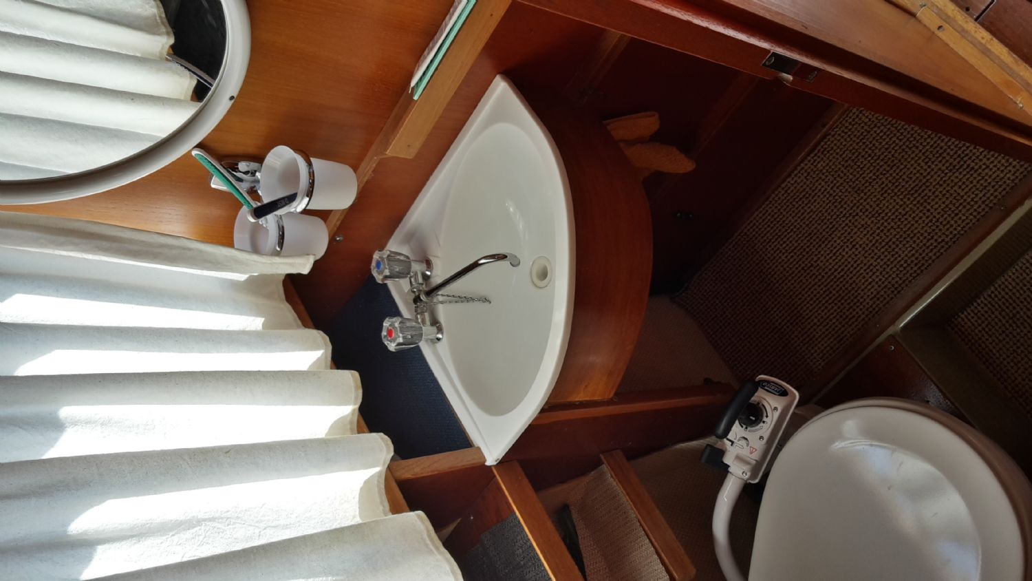 Och skrovets lutning gör det omöjligt att få till något åt det hållet, ja man kan ju ta bort tvättstället men det går ju inte att höja för att få bredare ändå då taket är lågt. Skrovet sluttar ju in i toan från sidan längst ned på den ’väggen’.