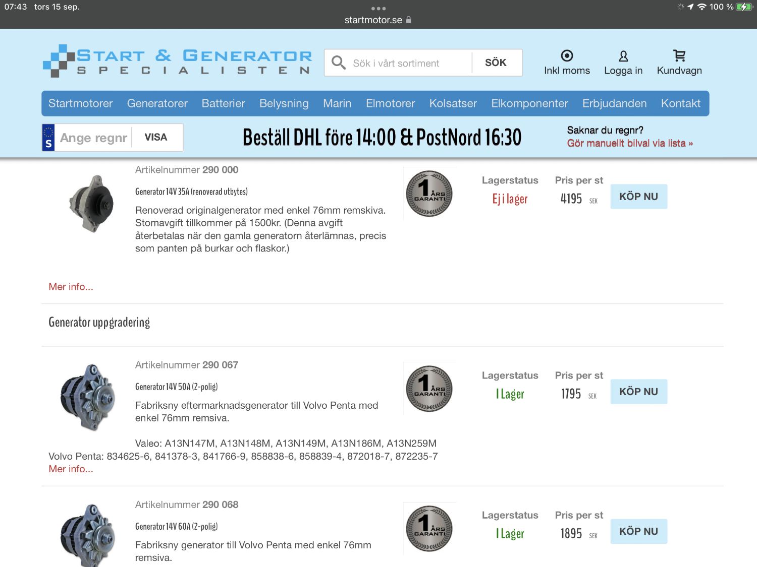 Generatorer kan du köpa på t ex Drevdelar, om osäker ring och tala med Ingemar så hamnar du rätt. 070-2246648