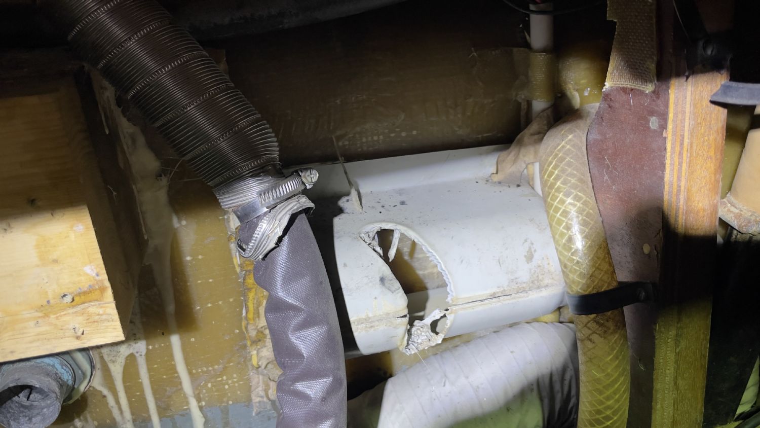 Idag när jag plockade ner dieselvärmaren för en genomgång upptäckte jag att dess grenrör smält hål i en av de tre anordningarna på babord sida.