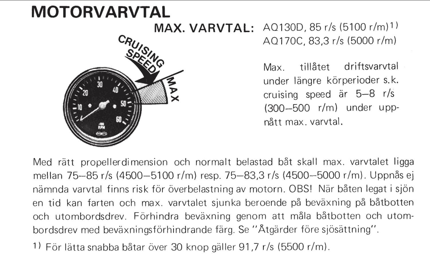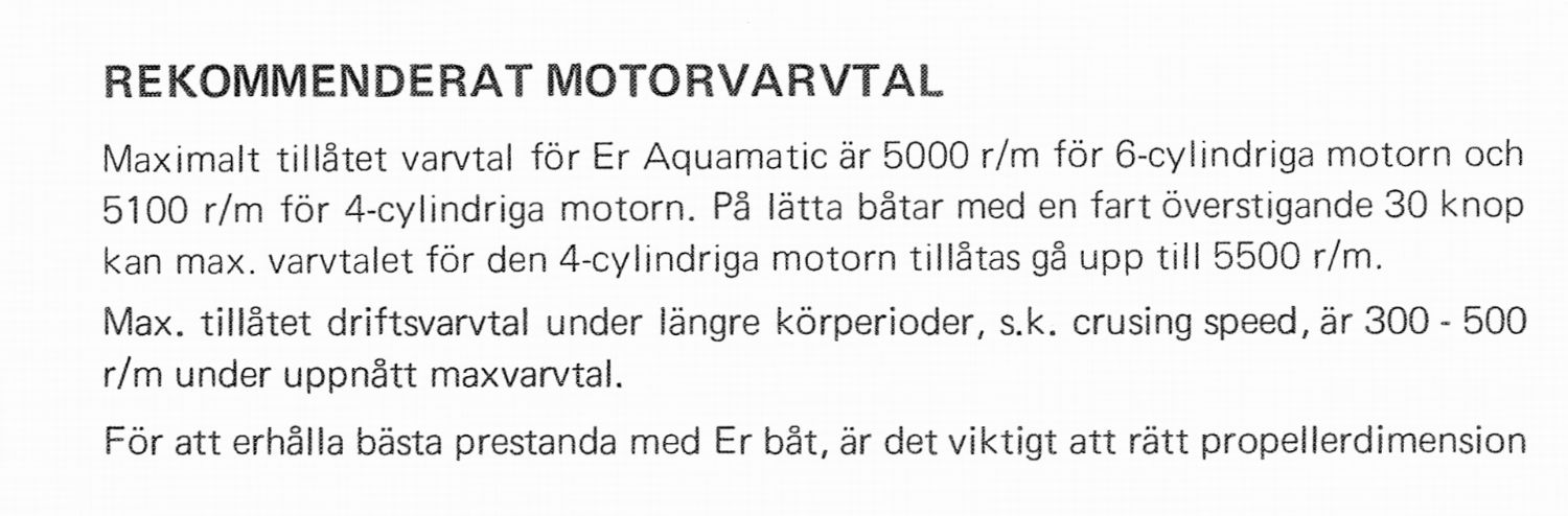 Det kan också vara så att propellrarna behöver vara större. Bifogar utdrag om rekommenderat maxvarv (samma för A- och D-varianten). Våra AQ130 varvar uppåt 5300 efter renovering av förgasare och tändfördelare. När jag tittar noggrannare på uppgifterna från tidigare ägare så ser jag nu att maxvarvet var 4700 (25 kn). Jag trodde det avsåg max arbetsvarv, men det lär avse fullgas.
