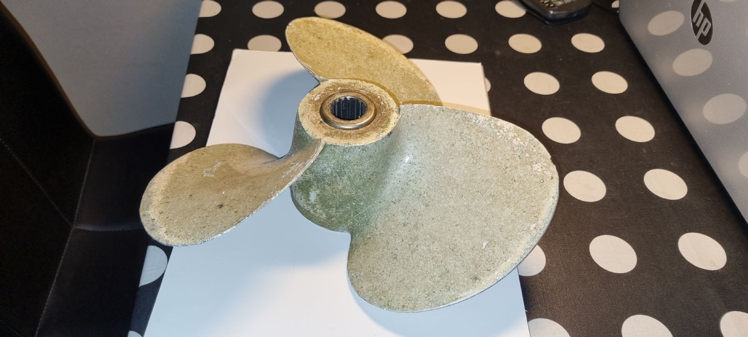 Våra nuvarande propar är treblad 14x15", enligt egen mätning. Har inte hittat någon märkning på dem.