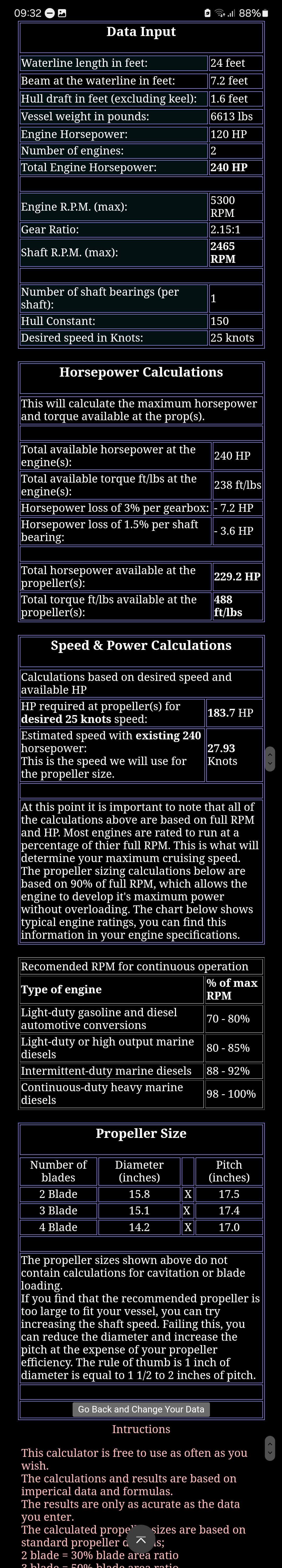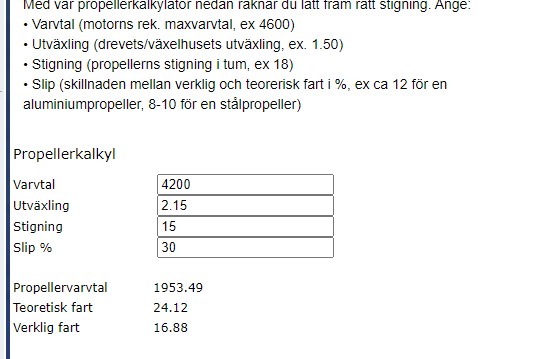 Jag tycker det verkar som något är fel med dina siffror, antingen utväxlingen i drevet, stigningen eller varvtal. Jag förutsätter att du mäter farten med GPS så att den är korrekt. Lägger man in dina värden i en propellerkalkylator så blir det ett väldigt högt slip tycker jag.