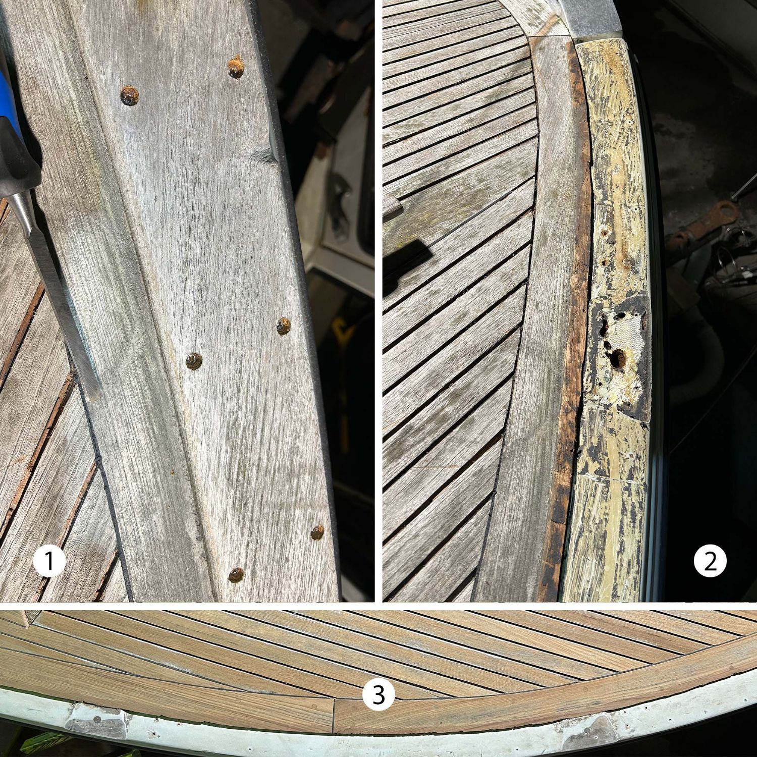 Den främre relingen på styrbords sida gick inte att rädda då den var limmad i överflöd. Med andra ord kommer jag behöva tillverka nya och det är här min kunskap tryter. Man kan tydligt se på ådringen i träet att den gamla relingen var utsågad i ett stycke (bild 1). Detta skulle troligtvis inte vara ekonomiskt försvarbart idag med tanke på den extrema böjning däcket har just här. Det skulle helt enkelt krävas enorma teakbrädor.