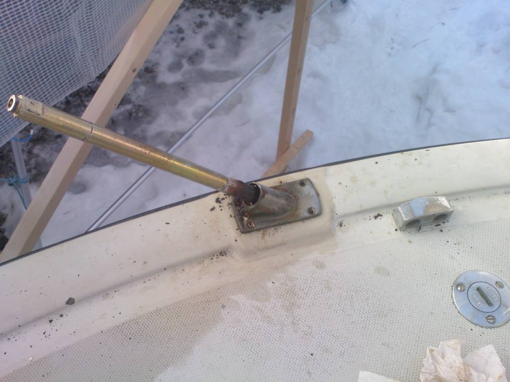 Når du får løs øvre delen( ved borring) så kan du ta ut stål-braketten under.Mulig du må frese bort litt glassfiber rundt denne, da det ofte er litt overlapp støp etter sammenplastring av skrog/overbygg. Bruk dremel eller lignende i blinde. På min OF kopierte jeg braketten i rustfritt og lagde nye bolter med 12 mm rustfri gjengestang med mange muttere på oversiden fra biltema somjeg igjen surret litt tape over for å få tight pasning.