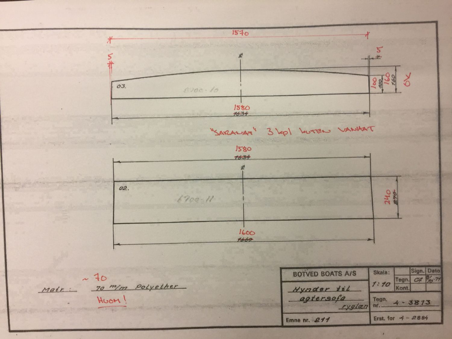 Alla ritningar finns i arkivet. Jag har låtit göra nya till min 21DC årsmodell 1977. Här ett exempel med lite egna anteckningar. Finns även för dynorna i kajutan