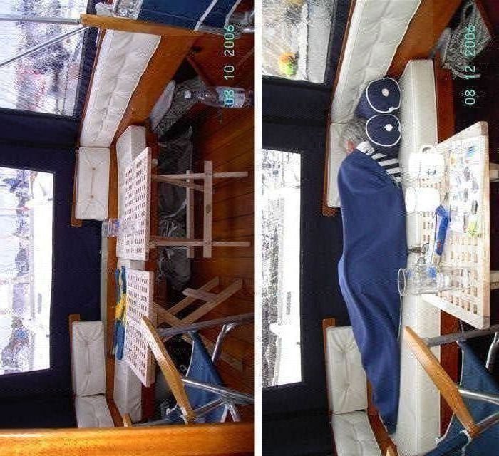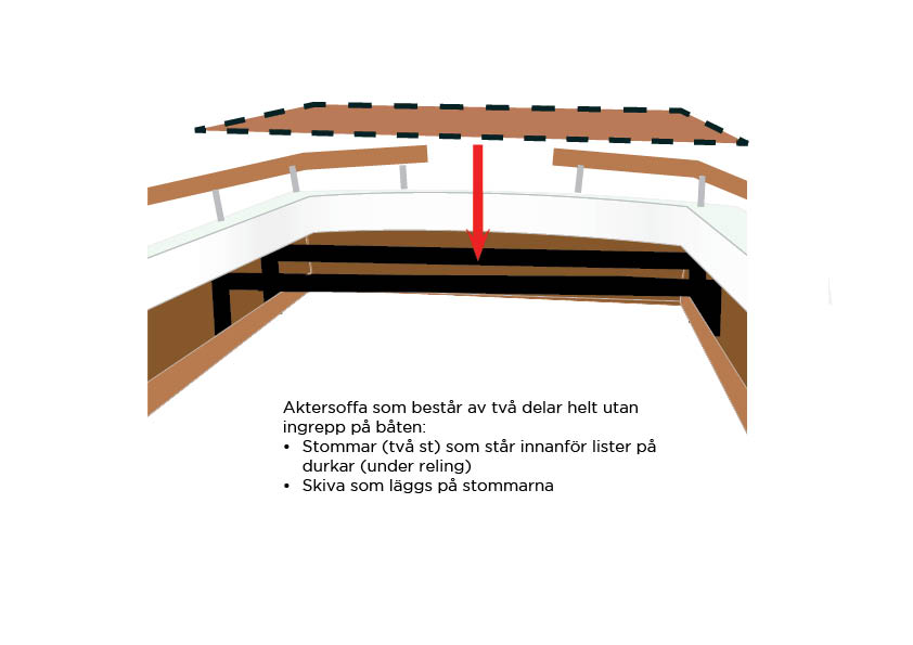 Har faktiskt tillverkat på egen hand två bänkar till min F 24 som inte har några fasta ben. De vilar på tre st mahognyklossar som jag skruvat fast i sidorna på däcksargen. Ett enda ben stöder i hörnet ut mot däck föröver. Detta möjliggör att jag kan hänga in mitt kapell under skarndäck utan att montera bort bänkarna. De går hur som helst lätt att ta bort bänkarna om jag ska ner i motorrummet.