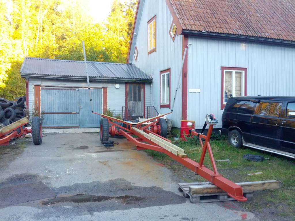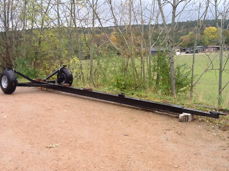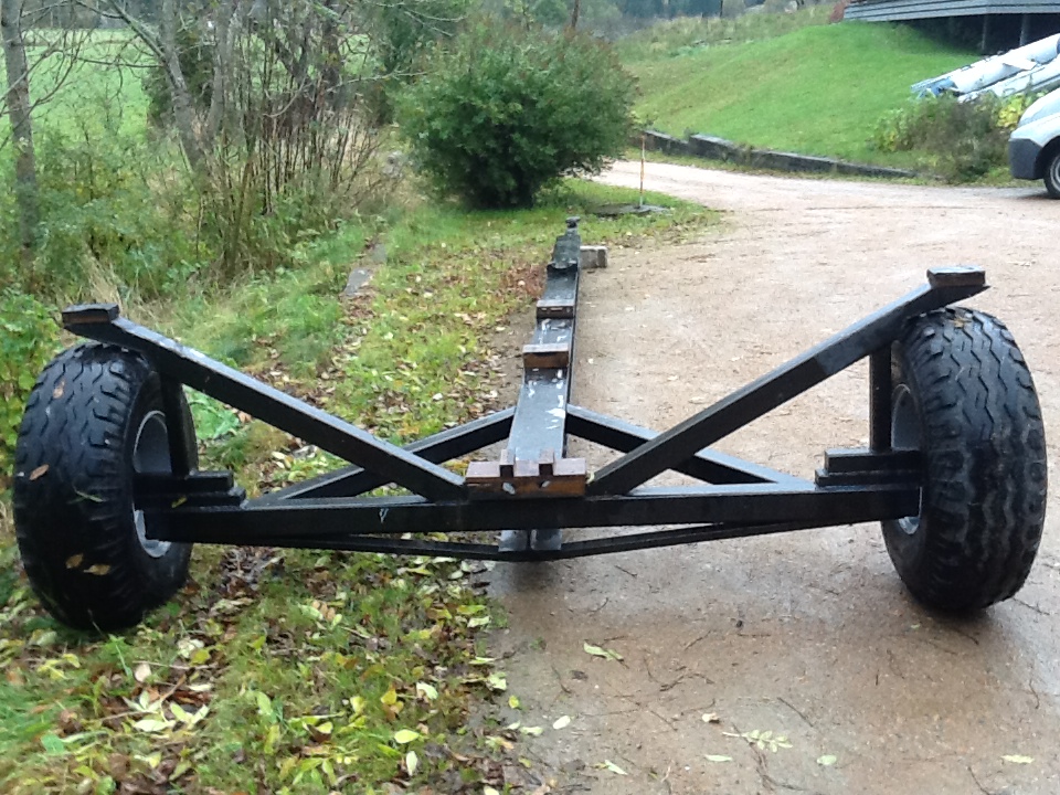 Jag vill tipsa om att överväga att sätta hjulen ungefär på platsen där tyngdpunkten för båten är, dvvs om ett hjulpar är tillräckligt. Man kan då höja och sänka aktern under förvaringen med domkraft, vilket kan underätta drevservice betydligt. Sjlävklart innebär det att hjulparet måste tåla hela båtvikten, dragkrokens belastning blir ju mindre, Då vi drar upp min båt kan traktorns gaffel (som har en dragkrok) höja och sänka dragpunkten och därmed kan även akterns läge justeras.