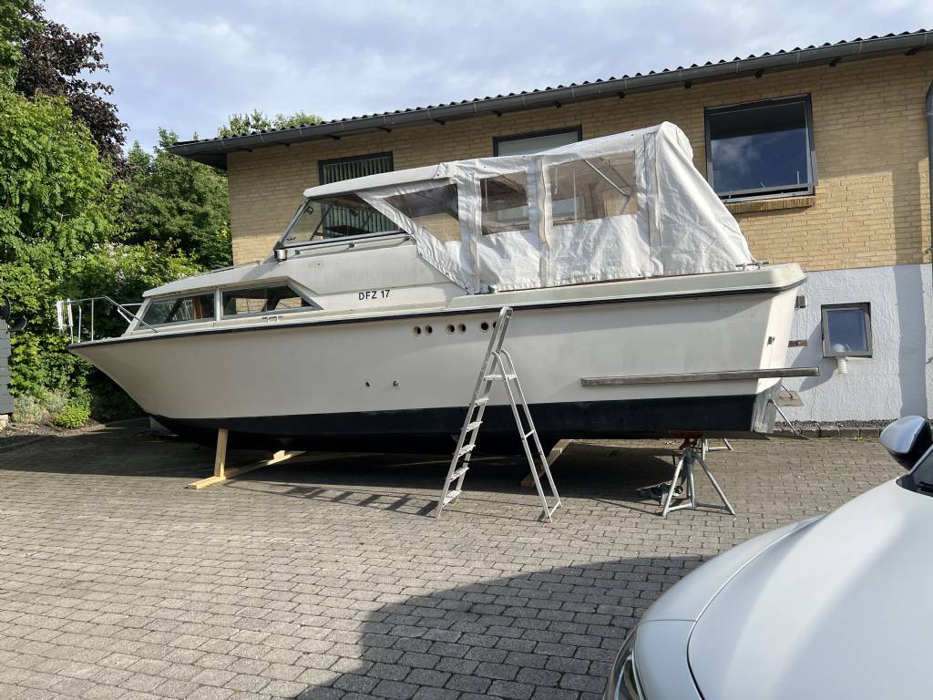 Fin 31er under renovering motorfundament istøbt motor komplet sæt fnm diesel 300 hp 307 timer koblet på et bravo 3 x diesel bund er lavet gulv i cocktit er nyt med lyddæmpning loft og sider i kahyt er nyt solcelleanlæg nyt bovpropel ny køkken er i gangværende og er lavet til at være i cockpittet to originale forsæder er indkøbt nye klyds ny vandtank og påfyldningsstudser til vand og diesel nyt teak indertag under hardtop brugt rustfri tank og oliefyr 4 kw instrumentbord er lavet og alt i cockpittet er lakeret nyrenoveret badeplatform med stige hydraulisk styring vandhaner div lys og pumper plus mange andre ting er allerede indkøbt pris 150.000kr kan købes uden motor og drev for 60.000