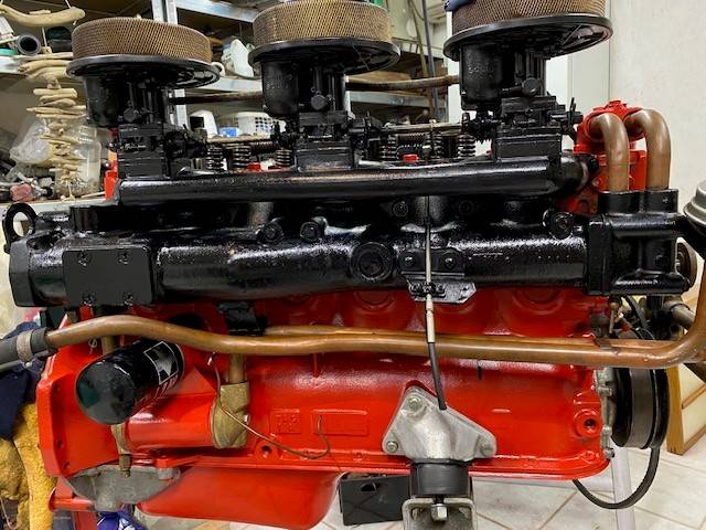 Motor er renset af og malet op, dele som strømfordeler, generator og impeller er skiftet til nyt. 3x karburatorer er ultralydsrenset.