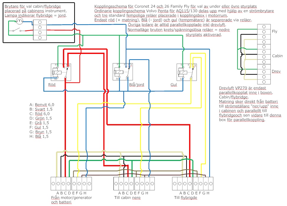 Det finns inget komplett schema över just styrplatserna i arkivet, förmodligen för att det är mest Volvo Pentas del av konstruktionen. Hos Penta har jag funnit en principskiss men ingen detaljerad som visar exakt var kablarna skall vara.